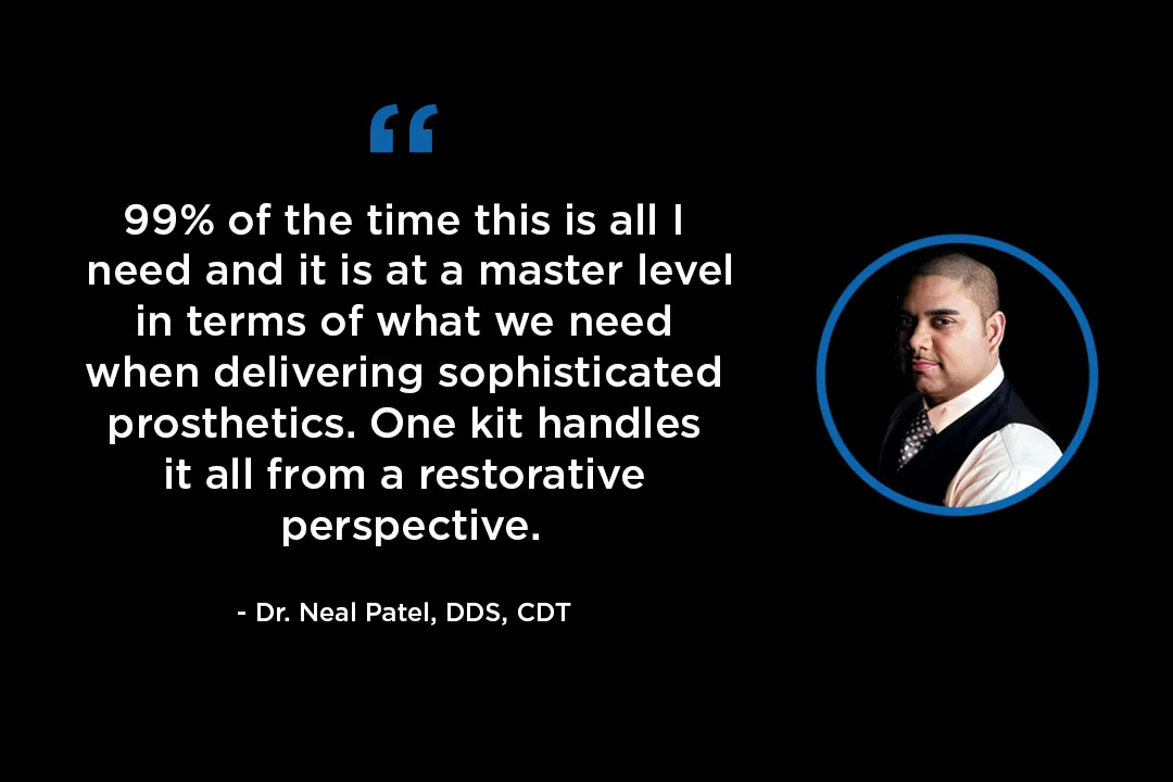Every instrument is meticulously designed and curated by Dr. Neal Patel, DDS, CDT to anticipate the clinical needs of restorative dentistry for the modern dentist — from digital impressions to final seat of comprehensive restorative dentistry at the highest level. Whether you’re prepping, imaging, or seating single units to All-On-X, everything you need (and everything you might need) to deliver exceptional aesthetic results is on your tray.