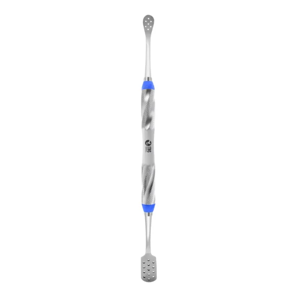 Double ended Molt and Tissue Retractor designed with a perforated end to filter suction of the graft site while keeping the bone graft securely in place.