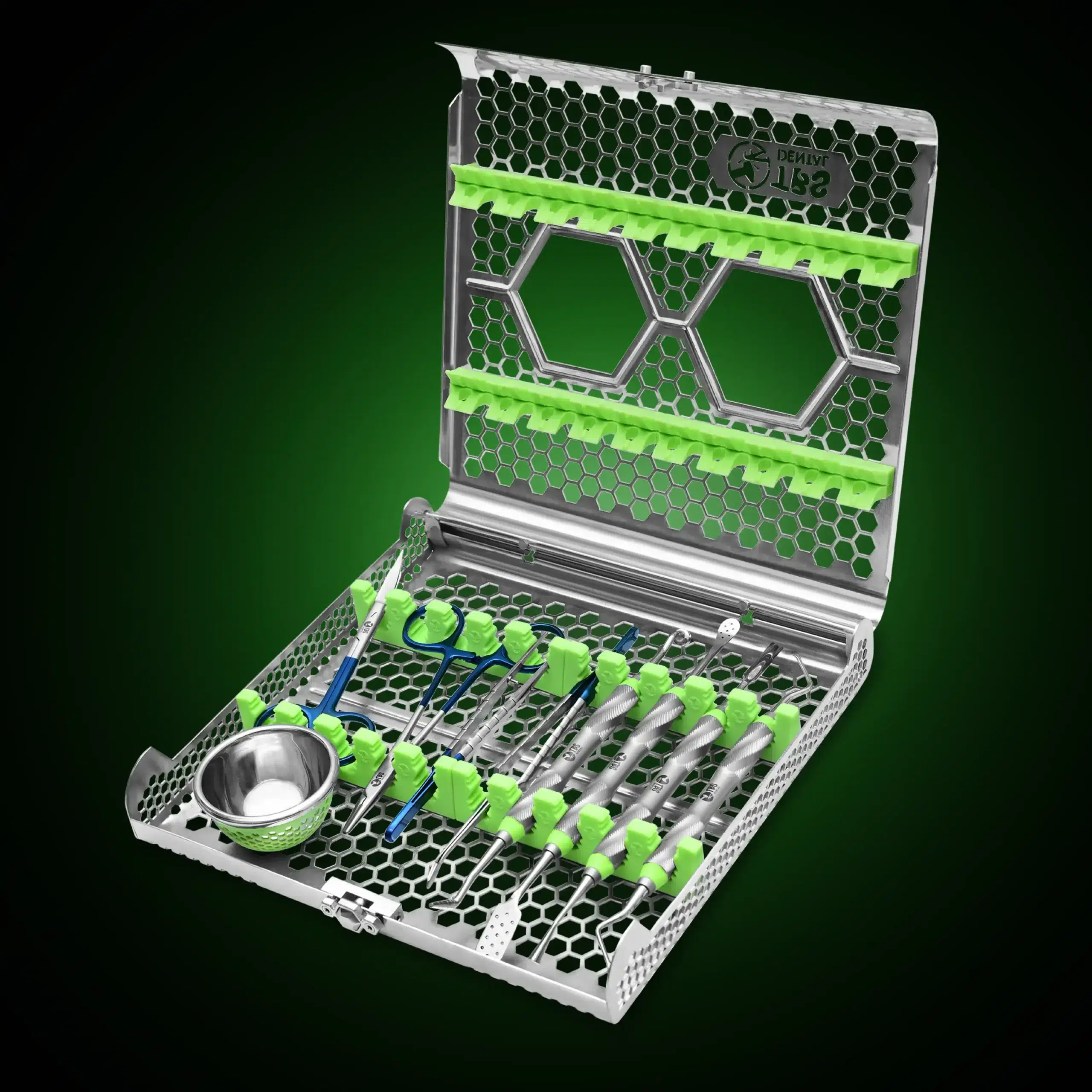 Ridge Preservation Kit includes one of each: Reznick Membrane Forceps, Sinus Plugger and Bone Scooper, Small Prichard & Molt 9 with Holes, Serrated Trumpet & Cone Packer, Serrated Razor Sharp Scissors, Curved, Long Serrated Curette – Small (Twist Handle), Needle Holder with Tungsten Carbide Tips, Adson Forceps, Mixing Bowl, and Hexette™ Sterilizable Cassette.