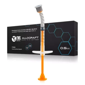 TBS Allograft Bone Particulate is a premium, mineralized 50/50 cortical–cancellous allograft particulate blend (250–1000 µm) designed to support bone regeneration through osteoconduction and to remodel fully to host bone. The prefilled syringe features a perforated hydration cap for quick, clean, in-syringe hydration and precise chairside delivery—minimizing handling time and mess.